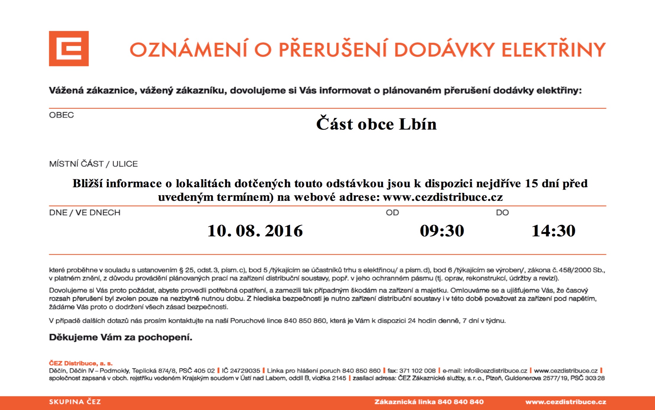 Oznámení o přerušení dodávky elektřiny 10.8.2016 – Lbín