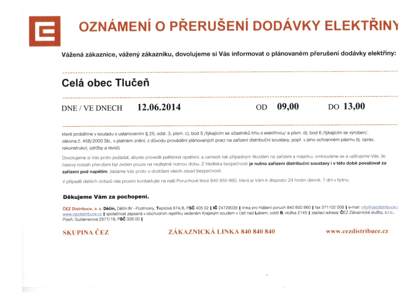 Oznámení o přerušení dodávky elektřiny – celá obec Tlučeň