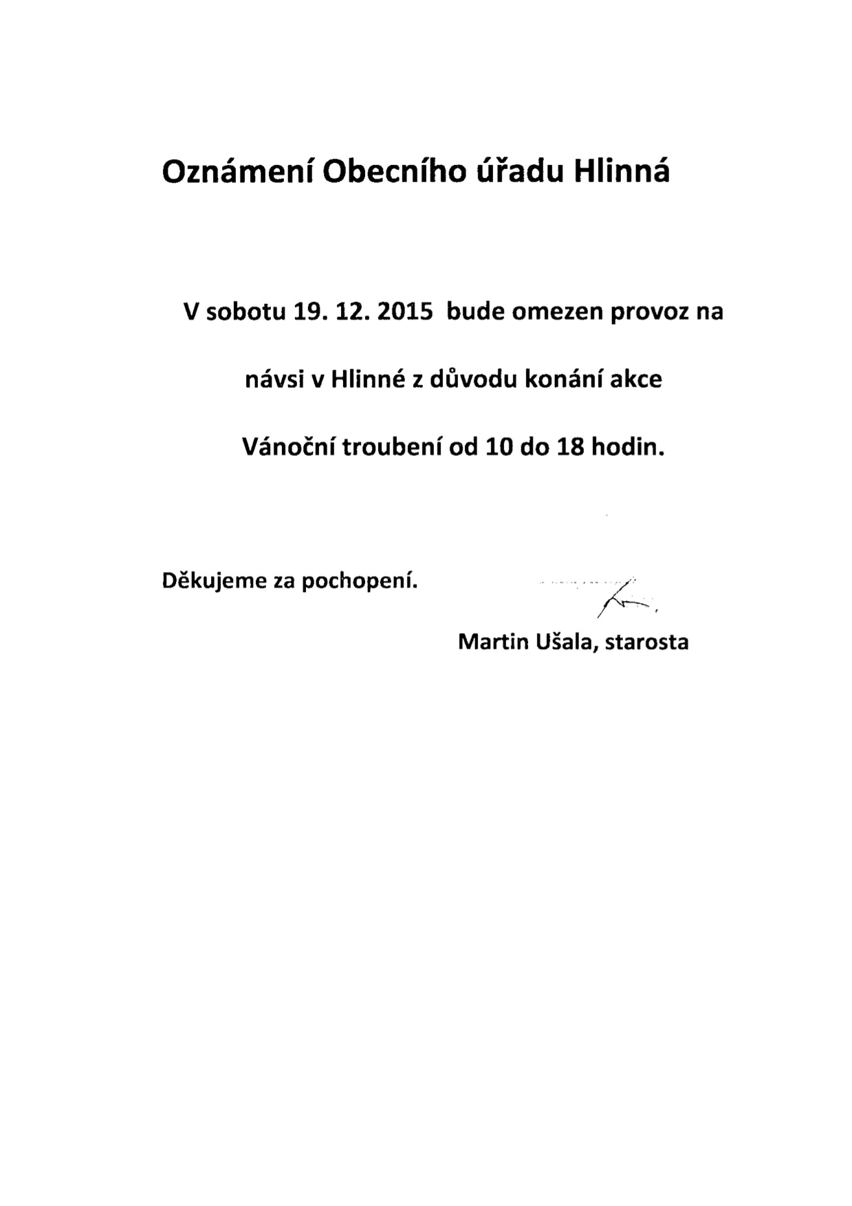 Oznámení Obecnío úřadu Hlinná o omezení provozu 19.12.2015