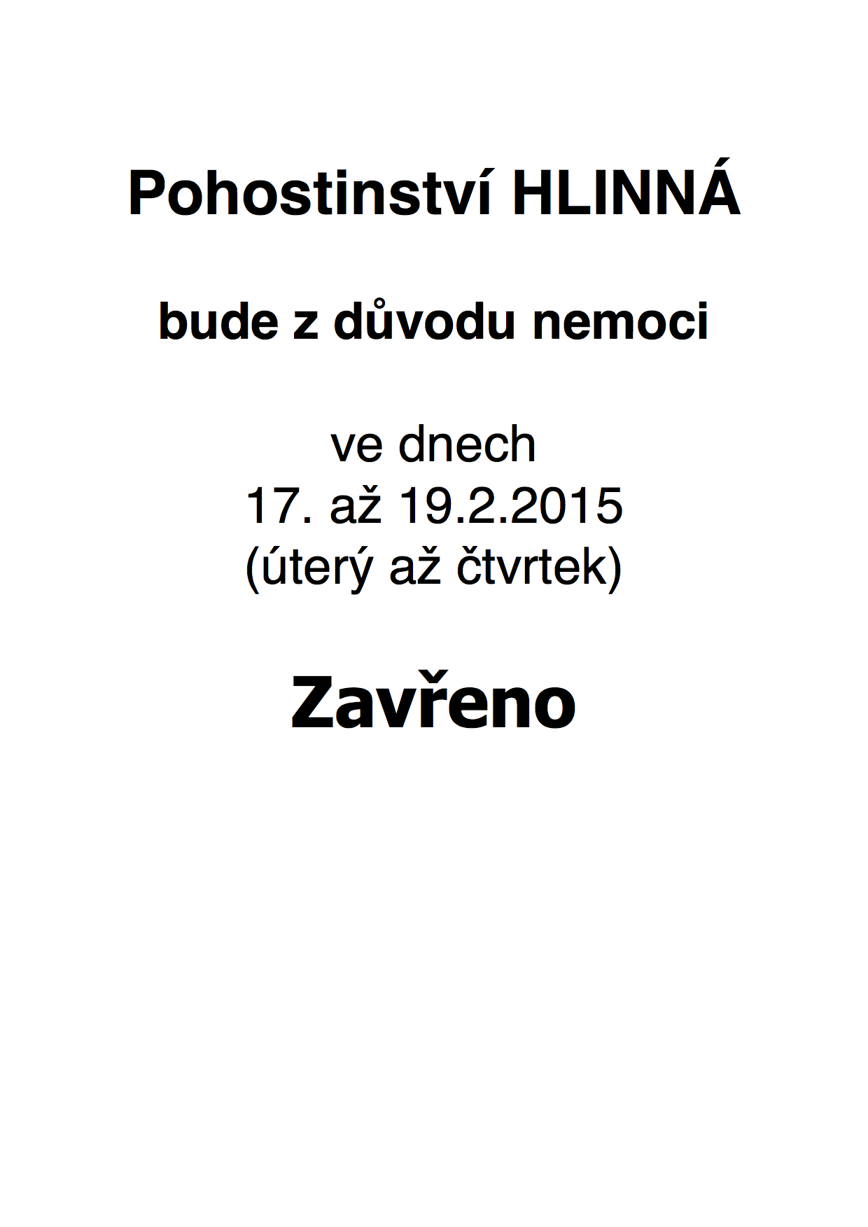 Pohostinsví Hlinná z důvodu nemoci uzavřeno