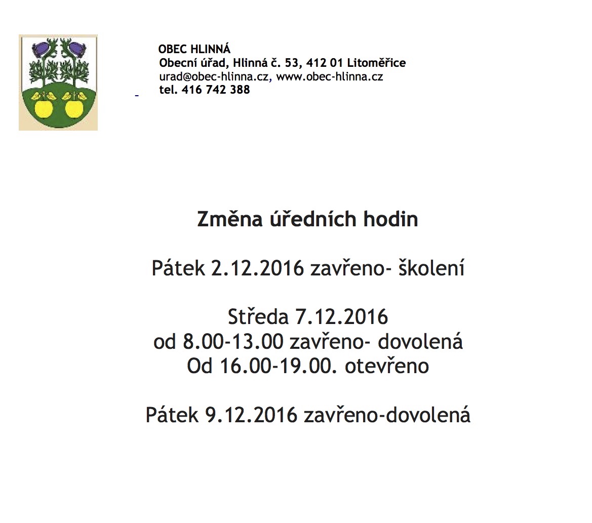 Změna úředních hodin 2., 7. a 9.12.2016