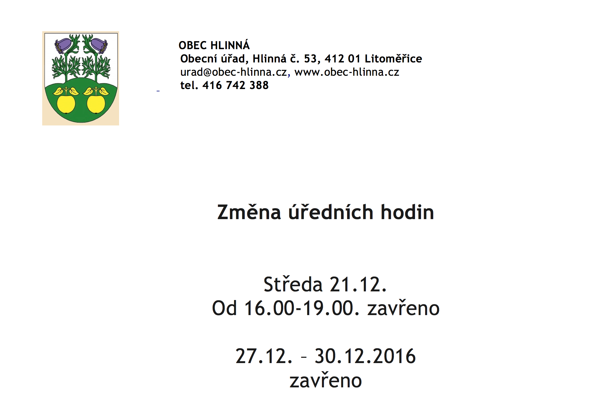 Změna úředních hodin v období vánočních svátků 2016